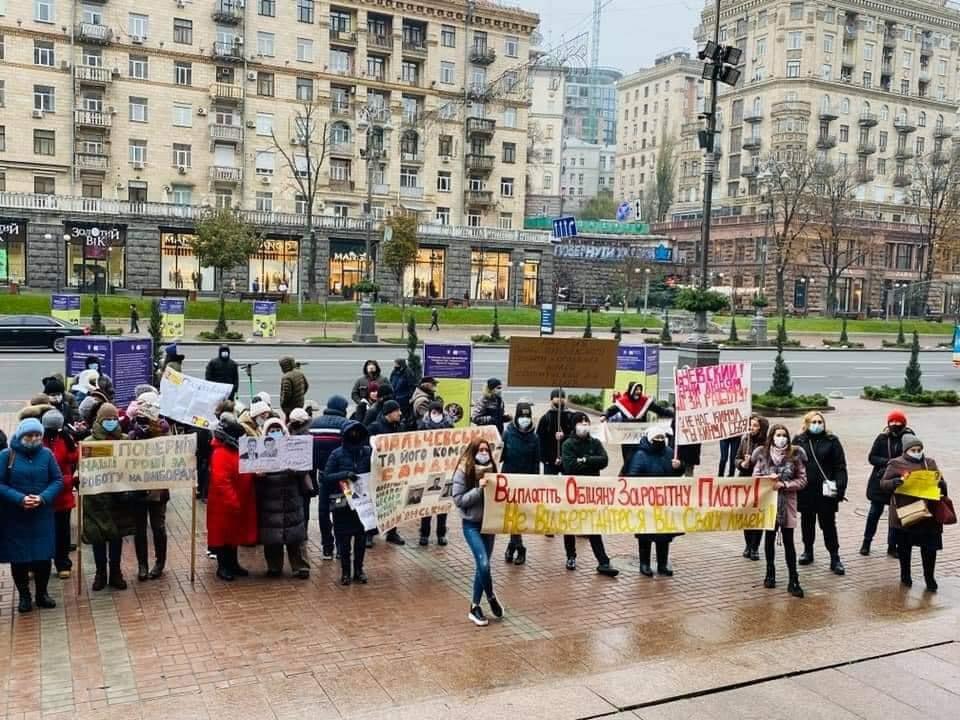 На знімку можна побачити людей з табличками «Виплатіть обіцяну заробітну плату, не відвертайтеся від своїх людей”, «Пальчевський та його команда – бандити», «Поверніть наші гроші за роботу на виборах», «Ти не нас кинув, ти кинув себе» та інші.