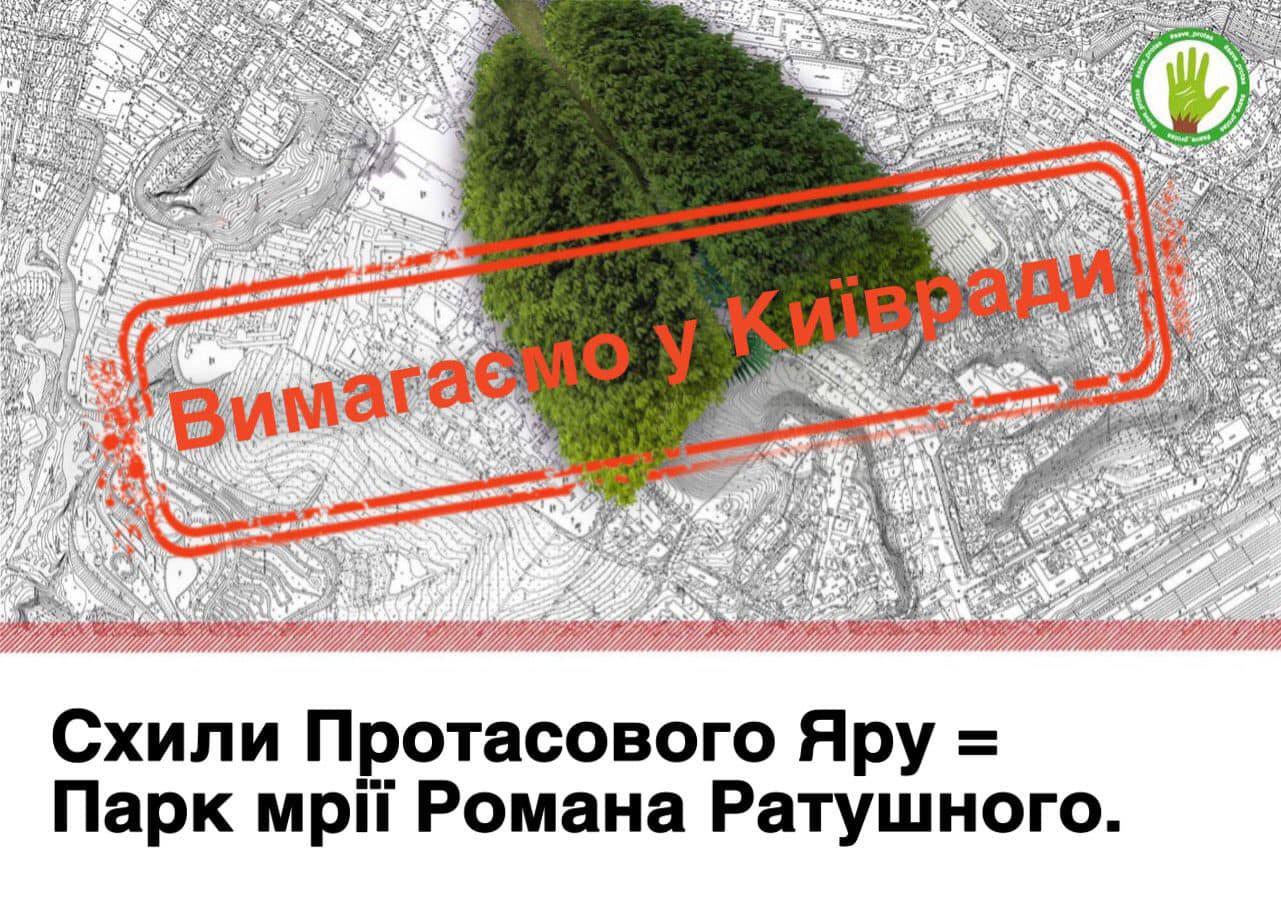 - створити ландшафтний заказник на території обох схилів Протасового Яру і зберегти в Києві 20 гектарів лісу.