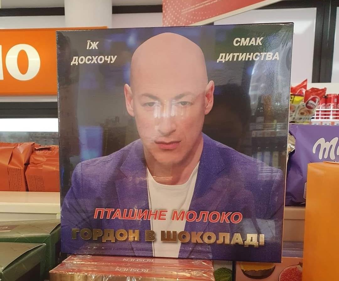 Йдеться про коробку цукерок з написом “Їж досхочу. Смак дитинсва. Пташине молоко. Гордон в шоколаді” та фото на коробці журналіста.