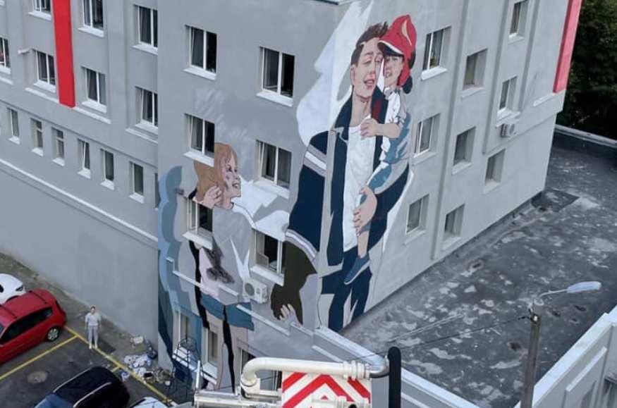 Мурал знаходиться на території режимного об’єкту, тому, повністю побачити його можна тільки на фото. На ньому зображений рятувальник, як люблячий батько не тільки власних дітей, але і десятків тих, кому він подарував друге життя. Частина мурала на торці будівлі являє рідного тата, фасад – другого батька (для врятованих).