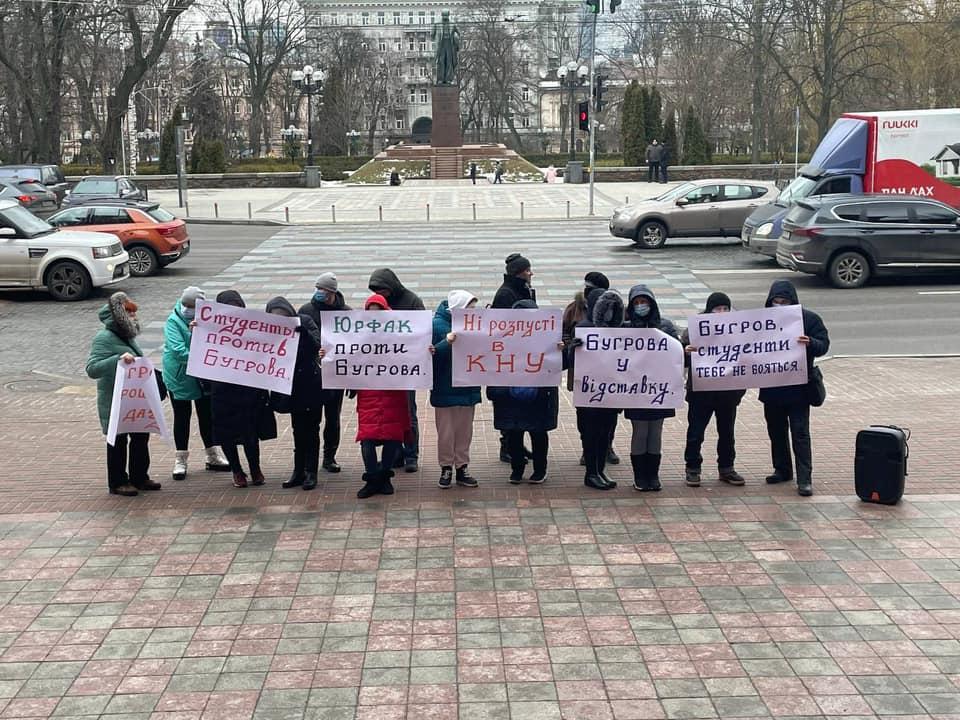 Кілька людей вийшли під червоний корпус університету, тримаючи в руках плакати “Студенти проти Бугрова”, “Юрфак проти Бугрова”, “Ні розпусті в КНУ”, тощо.