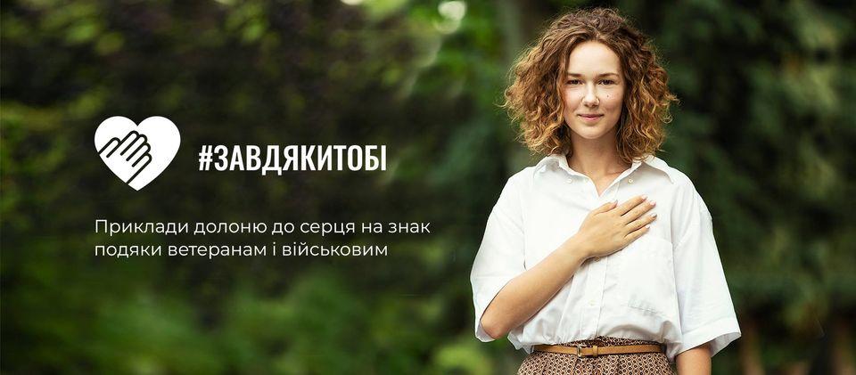 Долучайтеся до національної кампанії Завдяки тобі — руху вдячності військовим та ветеранам. Та зустрівши когось із них на вулиці, у кафе, на роботі чи у транспорті, прикладіть руку до серця на знак вдячності.