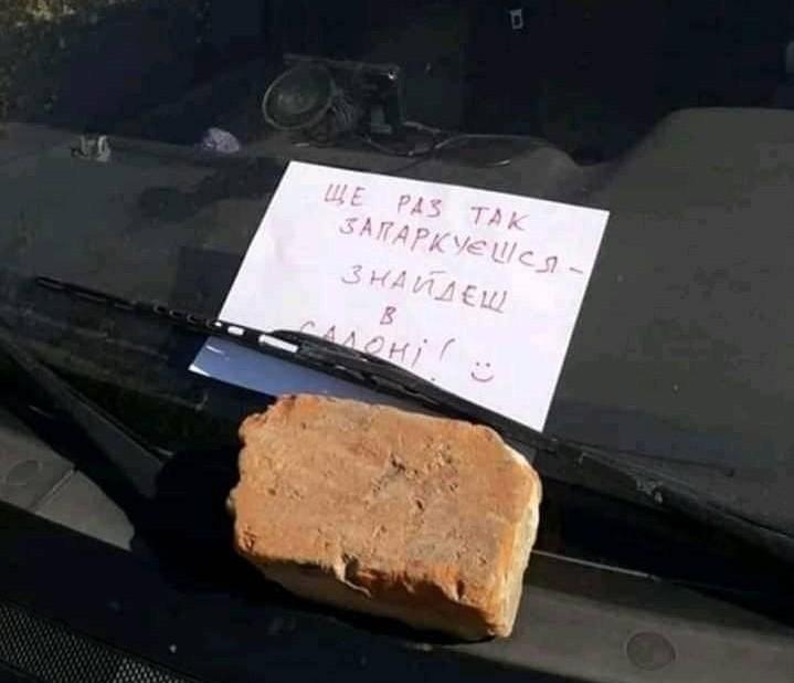 Гончарук відреагував на це, оприлюднивши власне фото, на якому також є листівка, але до слів “Ще раз так запаркуєшся – знайдеш в салоні!” додано цеглину.