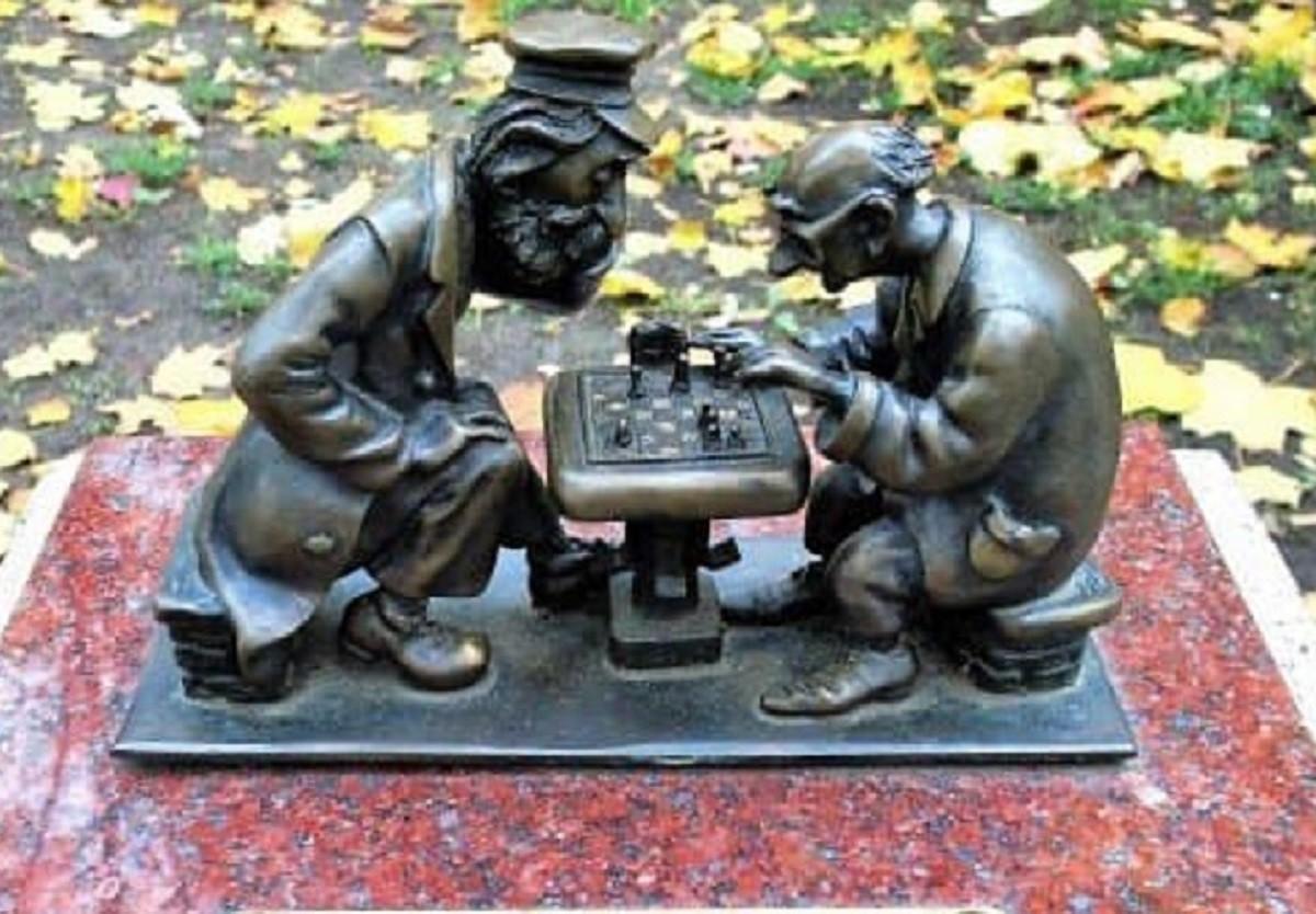 “Археологічні пошуки на території Києва та Вишгорода (1981) дають підстави стверджувати, що шахи були поширені і серед наших пращурів, адже знайдено дві кістяні шахові фігури, датовані орієнтовно 11–12 ст. Але масовою грою шахи стали набагато пізніше. Спочатку поодинокі гравці у шахи, шашки та доміно збирались у сквері біля Золотих воріт. То був не надто безпечний для гравців період, адже серед них було багато ветеранів останньої війни, а це був народ гарячий і на руку важкий. Згодом, коли бажаючих зіграти партію стало набагато більше, ніж шахівниць, виникла потреба у турнірах, і тоді уся чесна компанія знайшла собі краще місце — неподалік, у парку Тараса Шевченка. Шукати треба бронзову скульптурку у парку, вхід той, що ближче до вулиці Льва Толстого, на перетині із Володимирською”.