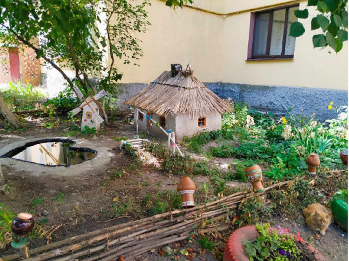 Під домом росте цибуля та петрушка, а клумба огороджена парканом