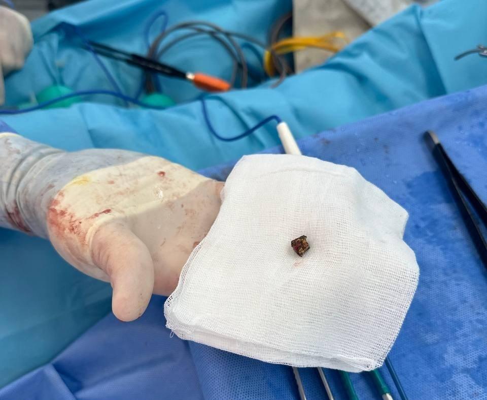 Інтраопераційно йому виконали рентген та ЕХО-КГ – де візуалізовано, що металевий уламок ще раз змістився й нині знаходився в кількох міліметрах до входу серцевий м’яз. Після тимчасової зупинку току крові до серця за допомогою спеціального турнікету судину було розсічено та спеціальним медичним магнітом хірурги евакуювали уламок.