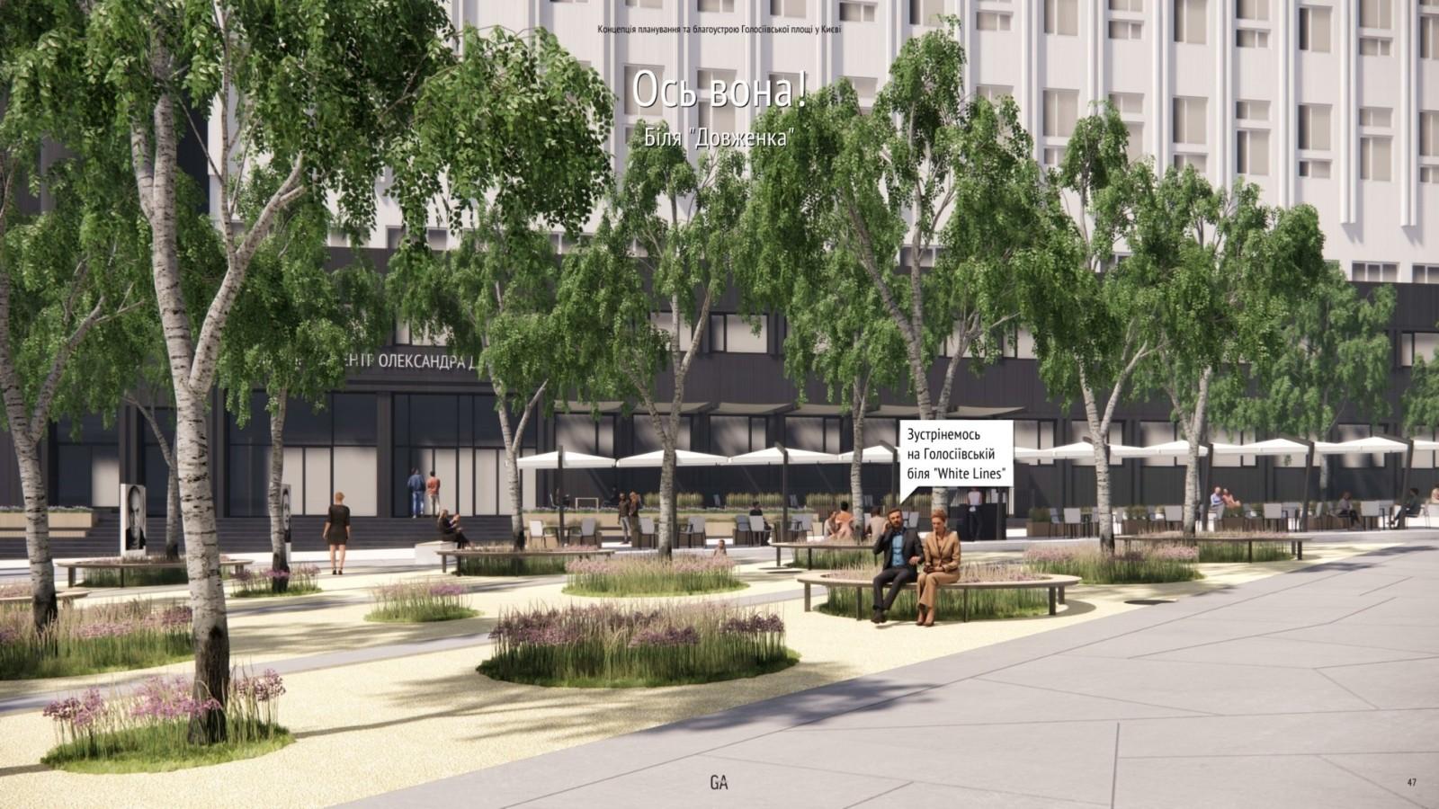 Урбаністи кажуть, що зараз Голосіївська площа – це гігантське барбекю для людей. Тому архітектори пропонують насадити більше дерев та кущів для озеленення площі та додаткового місця в тіні, а ще – облаштувати фонтан, який буде створювати прохолоду.