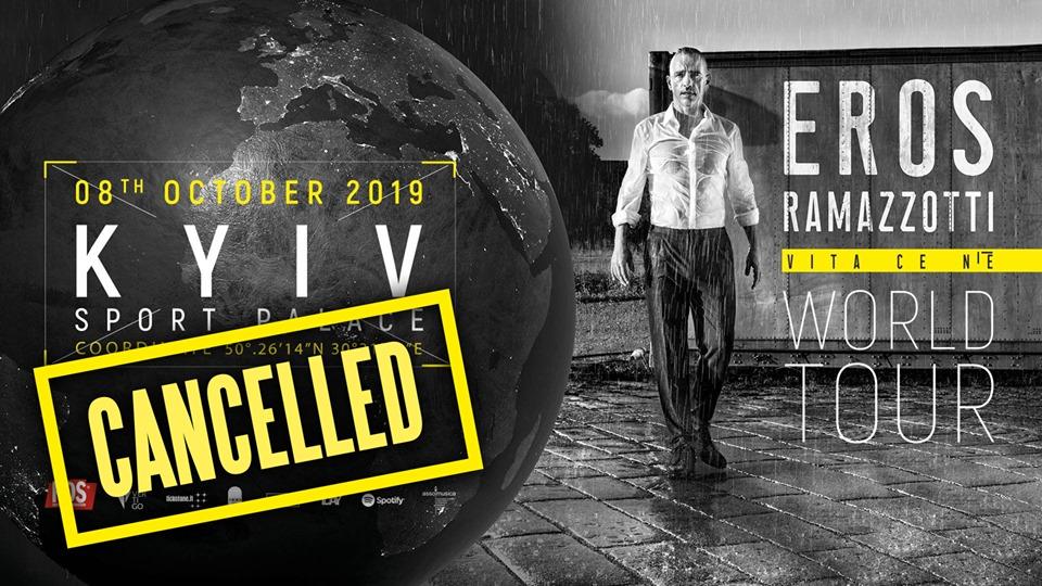 «В связи с непреодолимыми логистическими сложностями, связанными с доставкой концертного оборудования, необходимого для проведения шоу Эроса Рамазотти в Украине, по независящим от организатора и артиста причинам киевский концерт Эроса Рамазотти, заявленный на 8 октября во Дворце Спорта – не состоится», – говорится в сообщении.