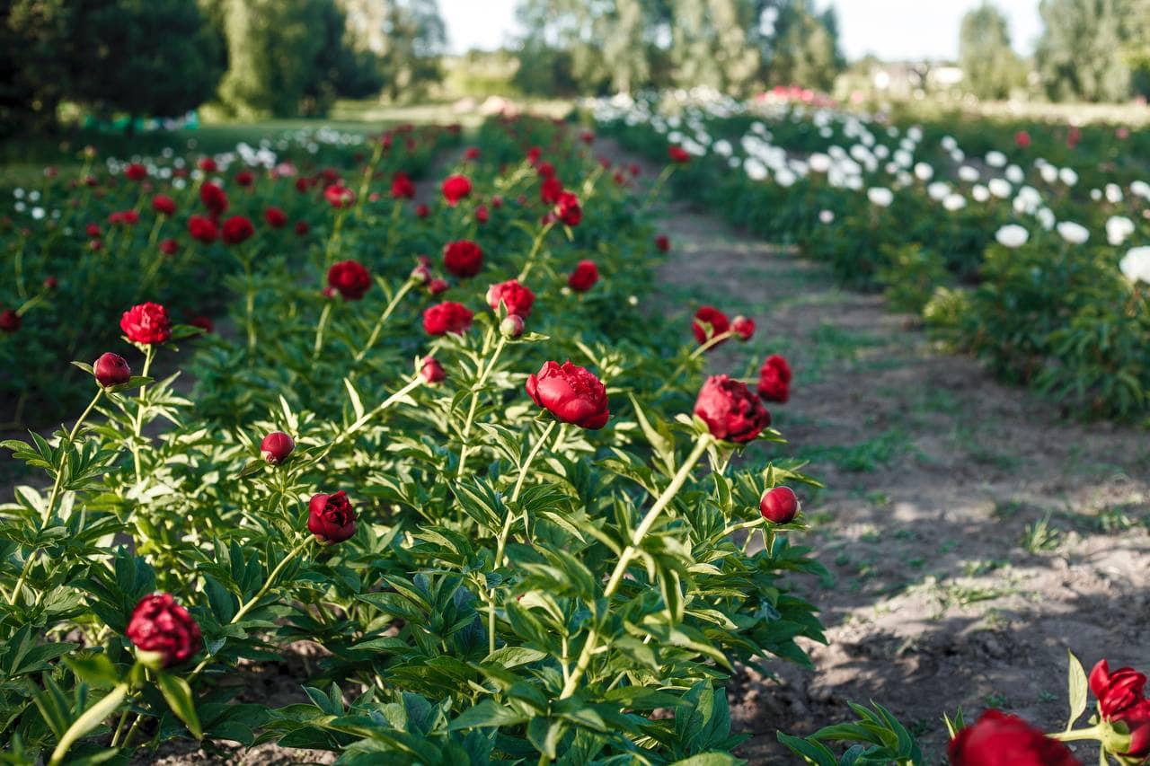 Тут можна помилуватись квітуванням більше 10 сортів топових півоній різних кольорів: білі, коралові, рожеві, бордові.