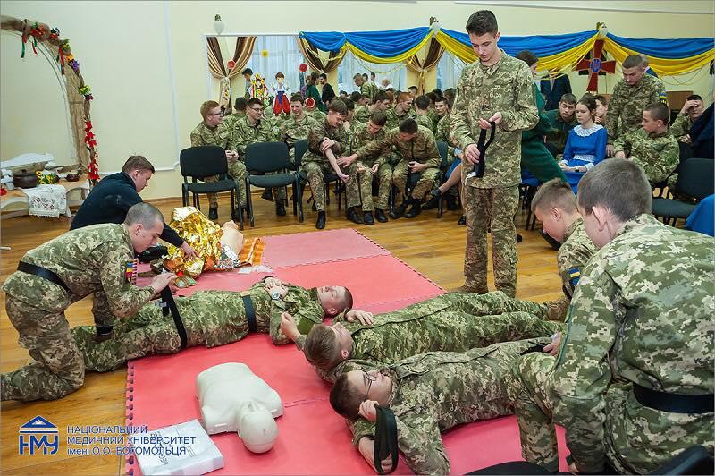 Зазначається, що факультет підготовки лікарів для ЗСУ Національного медуніверситету імені О.О. Богомольця організував виїзний майстер-клас із надання тактичної допомоги для ліцеїстів старших курсів ліцею-інтернату №23 «Кадетський корпус».