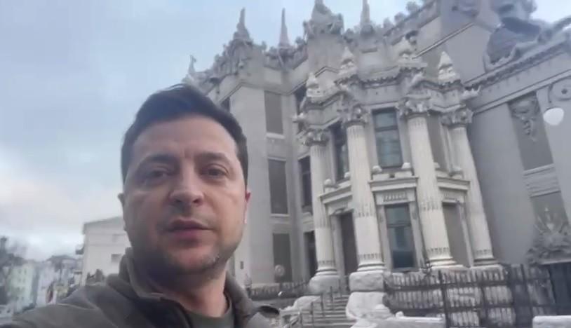 «Зараз в мережі з’явилося дуже багато фейковой інформації, що немов я закликаю складати зброю нашої української армії і йде евакуація. Значить так: я тут, ніякої зброї ми не складемо, будемо захищати нашу державу, тому що наша зброя — це наша правда. Наша правда в тому, що це наша земля, наша країна, наші діти і ми все це будемо захищати. Ось це і є те, що я хотів вам сказати. Слава Україні!», – сказав президент.