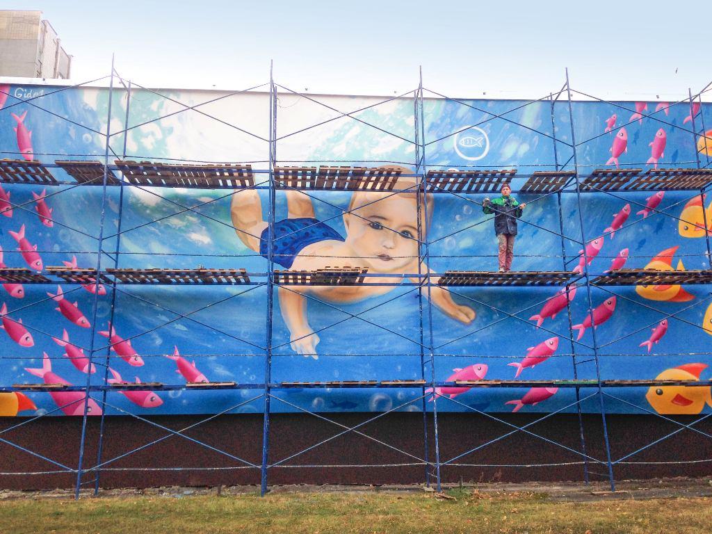 На столичных Березняках на стене бассейна детской поликлиники появился яркий мурал с изображением ребенка в голубой воде и рыбок. Об этом на своей странице в Facebook сообщил автор рисунка — киевский художник Виталий Гидеван.