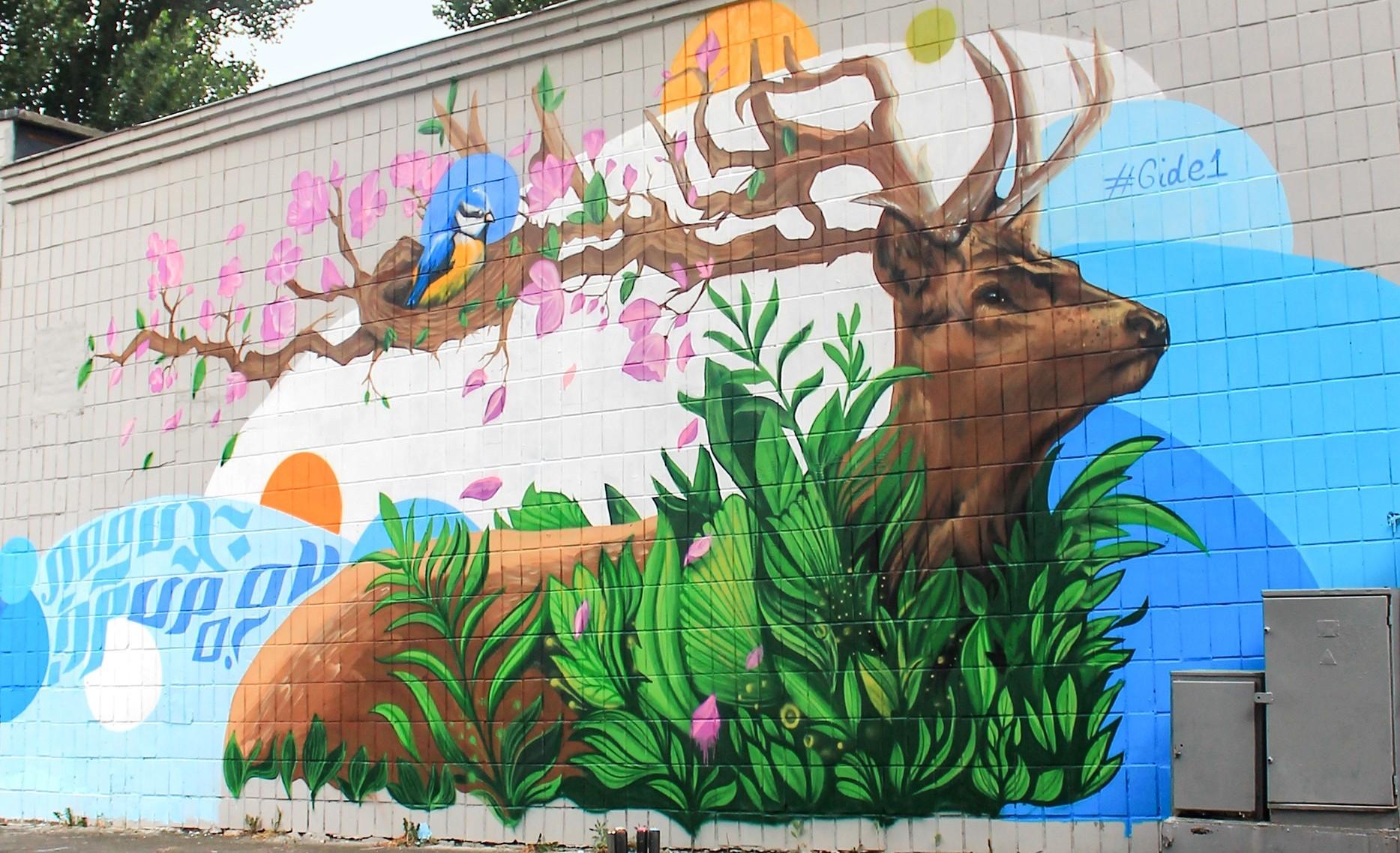 В Киеве на Левобережке появился новый красочный мурал с изображением оленя, рога которого переходят в ветви цветущего дерева с гнездом птицы. Фото своей новой работы опубликовал в Facebook киевский художник Виталий Гидеван.