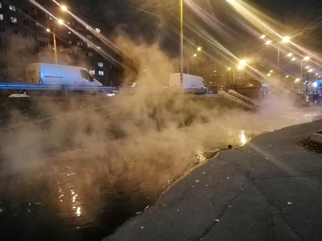Как сообщает жительница столицы Анастасия Крымова на своей странице в Facebook, горячая вода течет по тротуару в районе станции метро «Оболонь», улицу окутал пар.