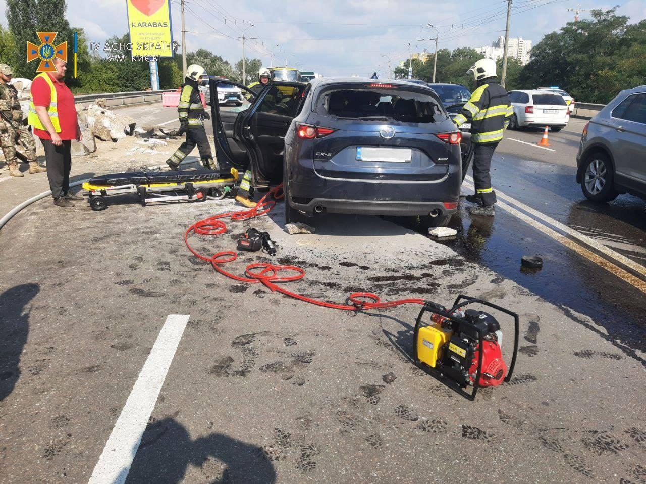 Як повідомили в ДСНС, сталося зіткнення автомобіля Mazda з бетонною опорою – блоками блокпосту, в результаті чого, водія затисло між сидінням та панеллю приладів.