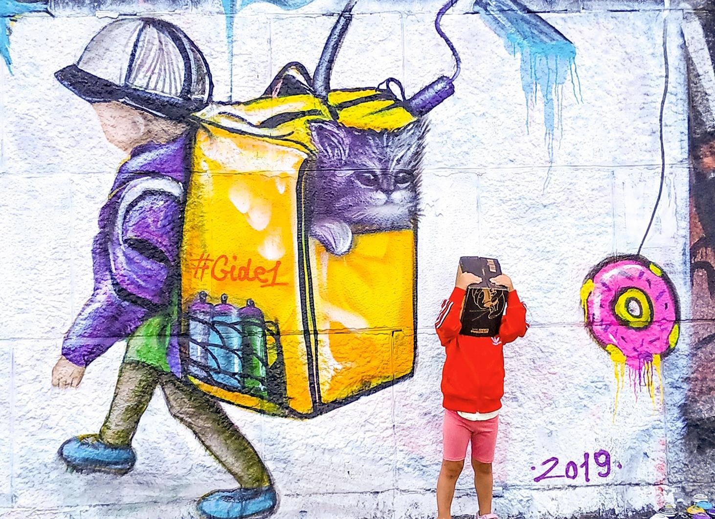 В Киеве на каменной стене набережной, недалеко от метро «Почтовая площадь», появился новый яркий мурал, на котором изображен ребенок с большим желтым рюкзаком.