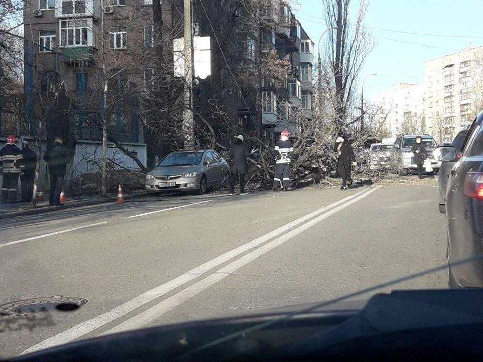 В пятницу, 22 марта, в Киеве на улице Ивана Кудри упавшее дерево повредило автомобиль. Об этом в Facebook сообщает dtp.kiev.ua.