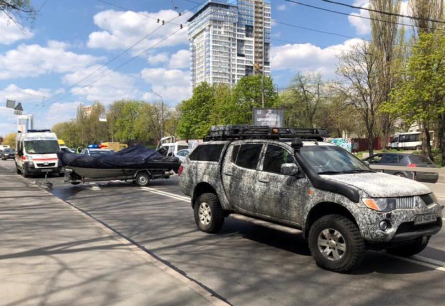 Как сообщает «Киев оперативный» в Facebook, у водителя Mitsubishi во время движения от машины оторвался прицеп с катером.