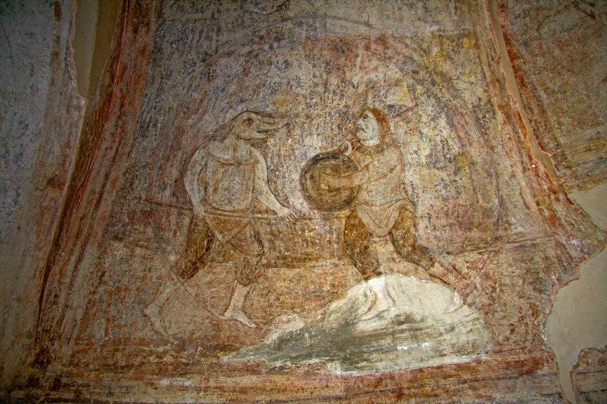 Отож до вашої уваги експонат у рамках флешмобу #CreepiestObject — це фреска «Готські ігри» у північно-західній сходовій вежі Софійського собору в Києві, початок ХІ ст.