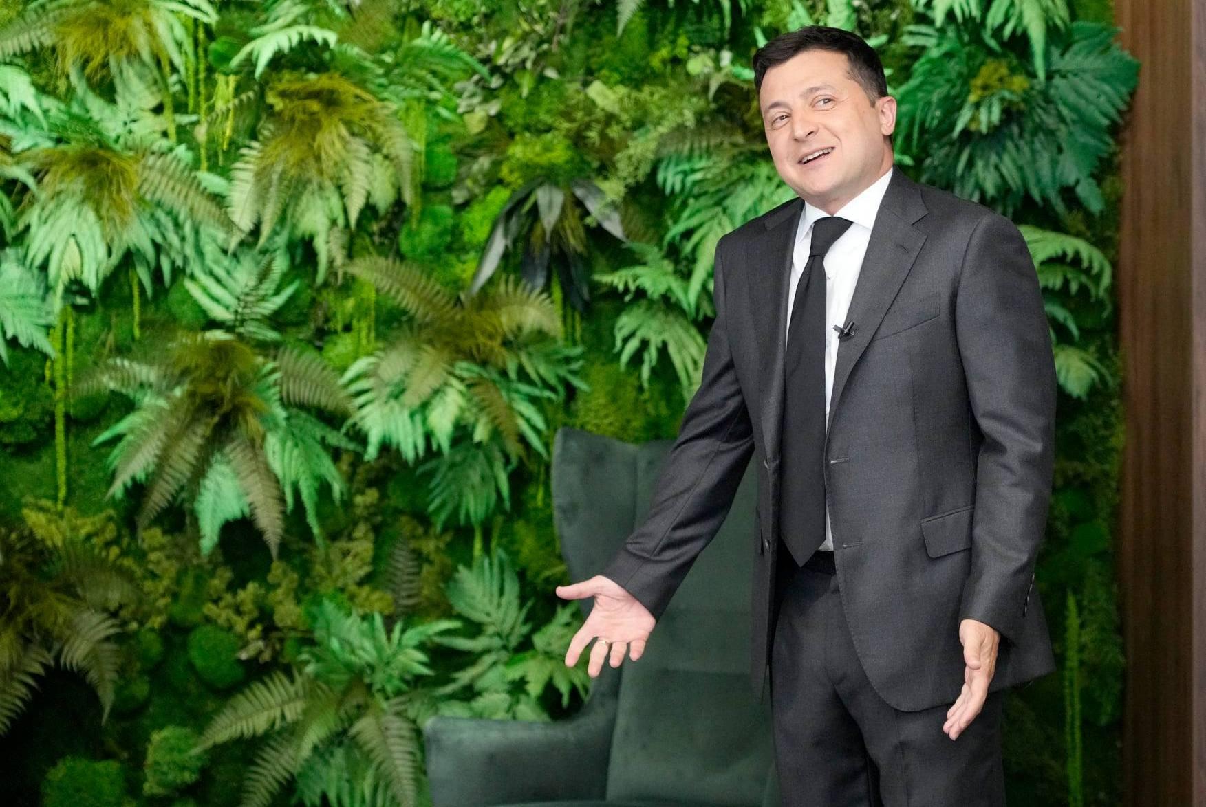 Позаду крісла Зеленського на стіні висить неонова вивіска “Центр Дії Президента”.