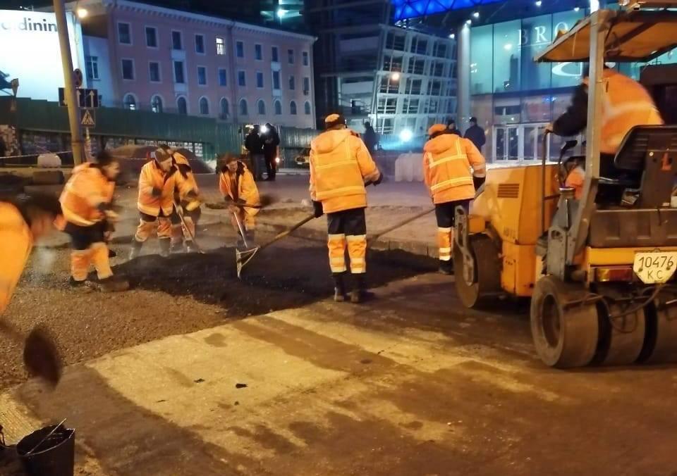 На улице Антоновича в Киеве сразу же после замены тепломагистрали начали восстановление покрытия проезжей части возле ТРЦ Ocean Plaza: обустроили песчано-щебеночную подушку и начали асфальтирование.