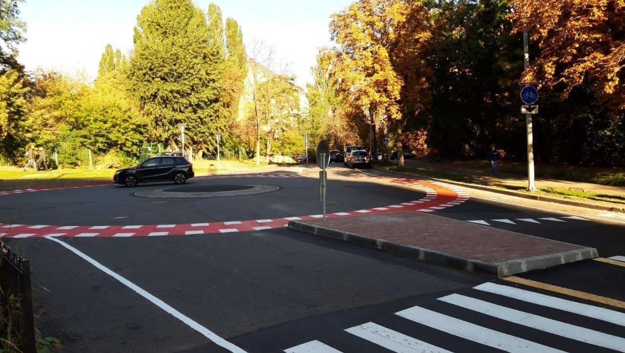 На кільці влаштували виокремлену велосипедну смугу позначену відповідною дорожньою розміткою, що дає можливість велосипедистам безпечно проїжджати перехрестя користуючись пріоритетом.