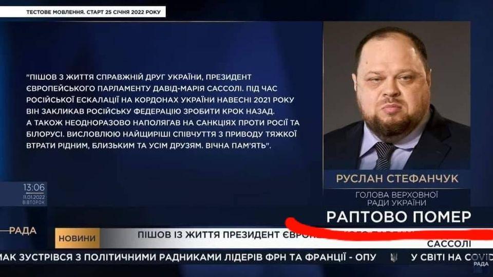 Саме цю інформацію коментував на “Раді” спікер українського парламенту Руслан Стефанчук. Але все б нічого, якби в цей же час до напису “раптово помер” не розмістили фото Стефанчука.
