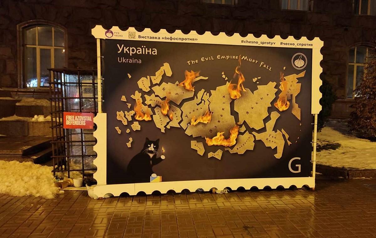 «Створювати та встановлювати марки з низкою пророчих сюжетів для нас вже стало хорошою традицією. Протягом 2023 року кияни та гості столиці радо фотографувалися з нашими марками, а у російських пропагандистів знатно підгорало», – розповідають ініціатори акції.