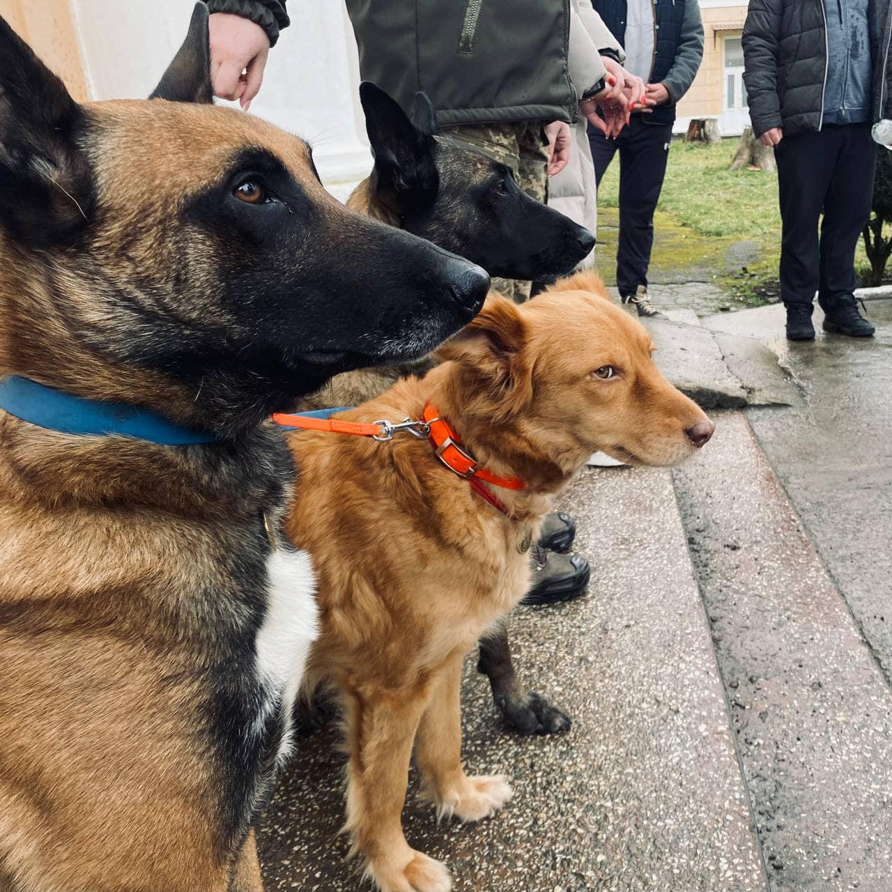 Співробітниця кінологічного центру поліції Київської області Катерина та її чотирилапі вихованці – пес-детектор з пошуку вибухових речовин Бентлі, службово-розшукова собака Ванда та собака емоційної підтримки Поля перебували у відрядженні в одному з військових госпіталів, що спеціалізується в тому числі і на медико-психологічній реабілітації оборонців країни.