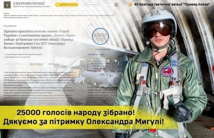 Понад 25 тисяч голосів українців достроково зібрала петиція на підтримку присвоєння почесного звання «Герой України» з удостоєнням ордена «Золота Зірка» майору 40 бригади тактичної авіації «Привид Києва» Олександру Мигулі. Про це повідомили побратими льотчика з 40 бригади тактичної авіації “Привид Києва”.