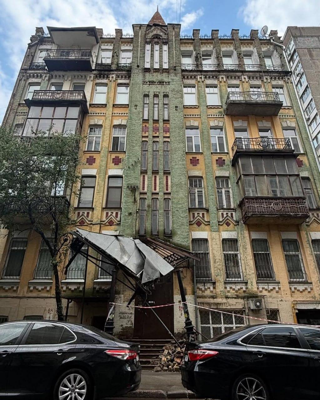 Буревій в столиці повністю зруйнував унікальний дашок під’їзду прибуткового будинку дворянки Евеліни-Францішки Шмідт на вул. Вільгельма Котарбінського, 21, у районі Лук’янівки.