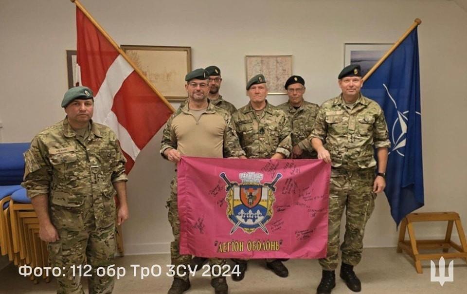 Прапори Добровольчого Формування Легіон Оболонь, яке знаходиться в підпорядкуванні 112 ОБр ТрО, тепер майорять в посольстві України в Данії та в одному з підрозділів Національної Гвардії Данії.Це стало можливим, завдяки Капеланській місії до Копенгагена Сергія Бережного – капелана