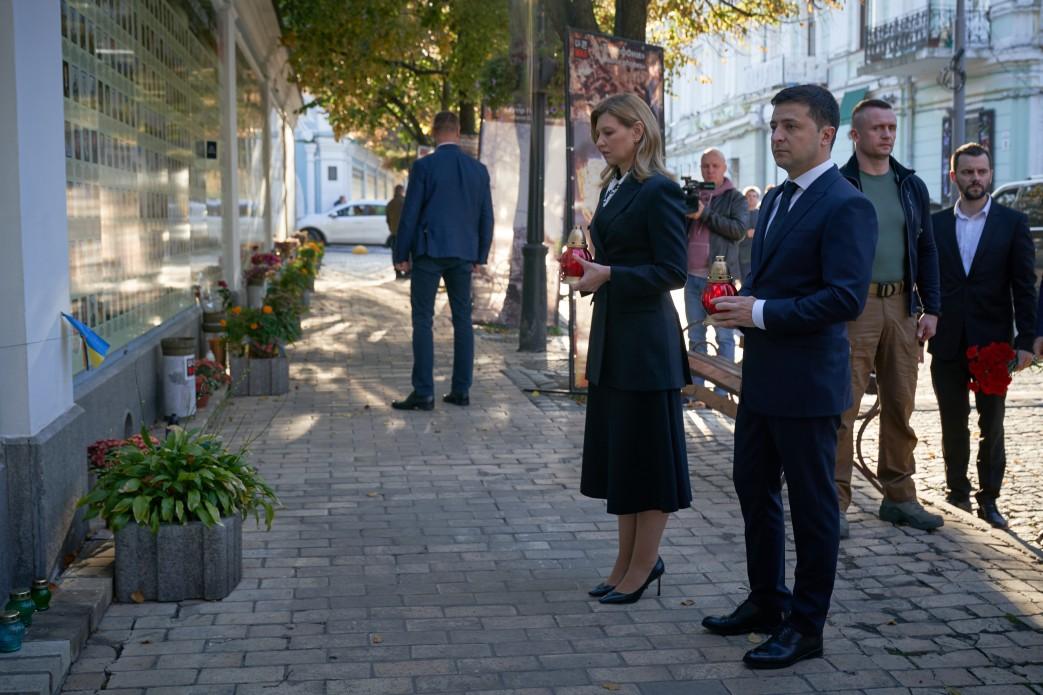 Супруги возложили цветы и установили лампадки у Стены с именами погибших за единство Украины военнослужащих и правоохранителей, которая находится возле Михайловского Златоверхого монастыря в Киеве, и почтили минутой молчания их память.