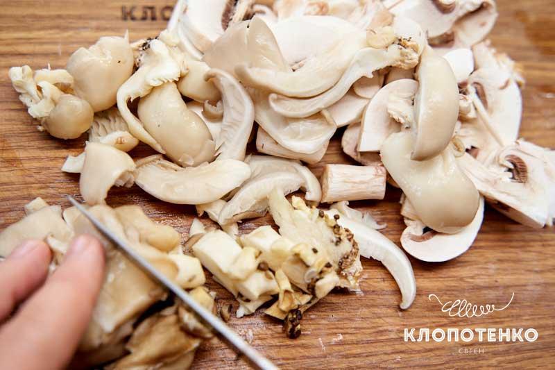 Помийте по 200 г печериць і глив. Наріжте гриби довільними шматочками.