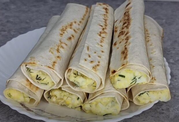 Трубочки з лаваша з сиром та яйцями легкі та швидкі в приготуванні та смакують навіть тим, хто сидить на дієті.