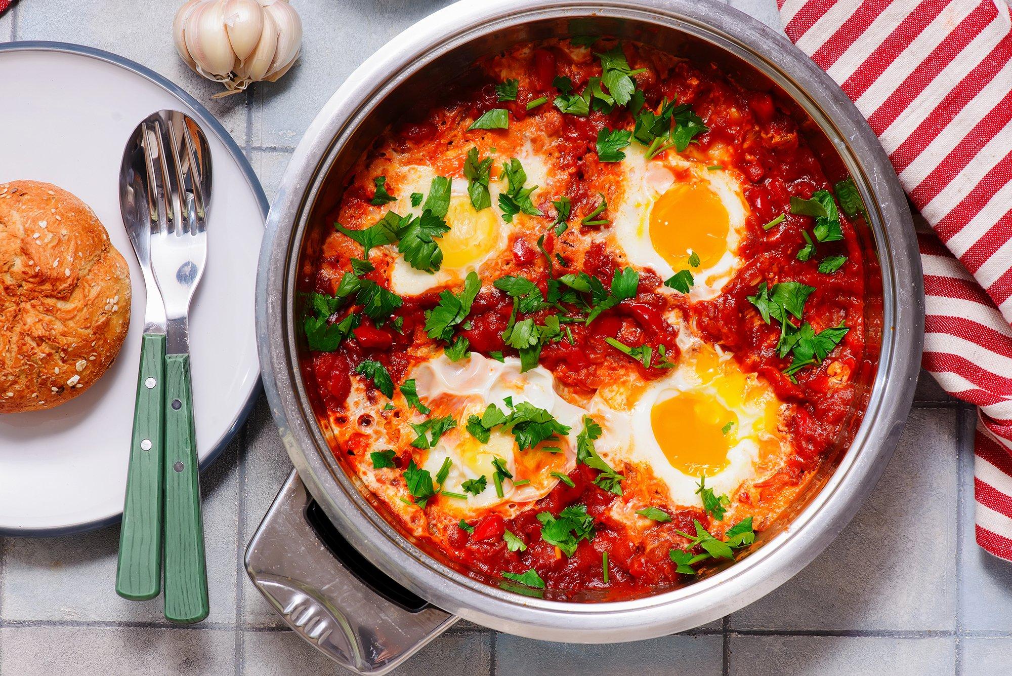Пропонуємо рецепт шакшуки - яєшні, яка готується на томатах та перцях, приправлена спеціями. Походження цієї страви приписують жителям Мароко, однак існує думка, що першими її почали готувати в африканському Тунісі. Також називаєть походження Турції, Ізраїлю або Ємену. Рецепт пропонує Shuba.