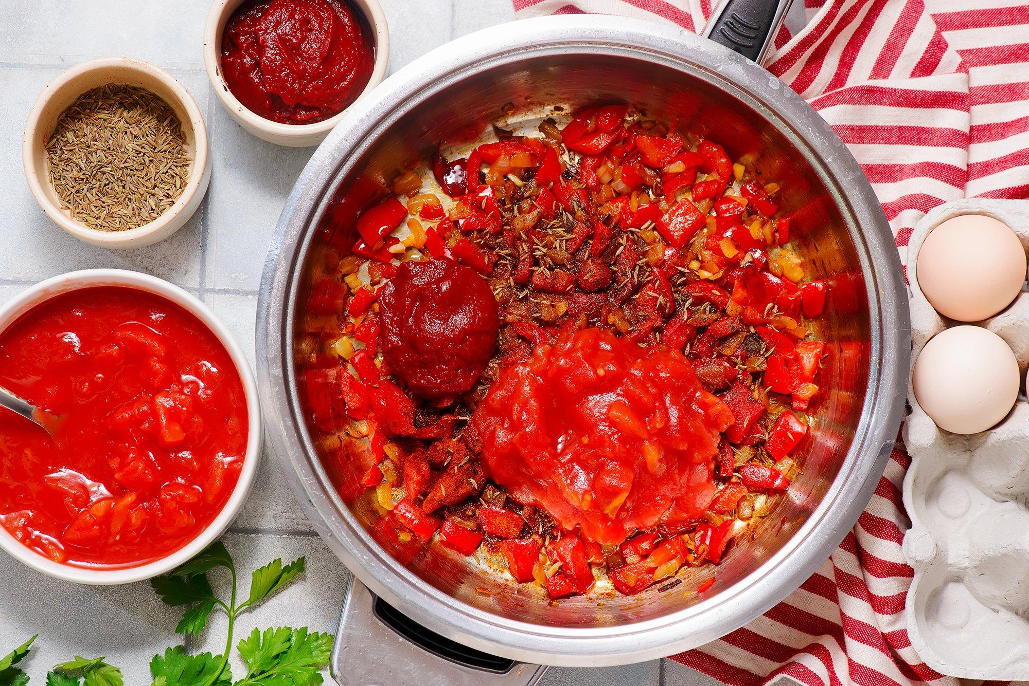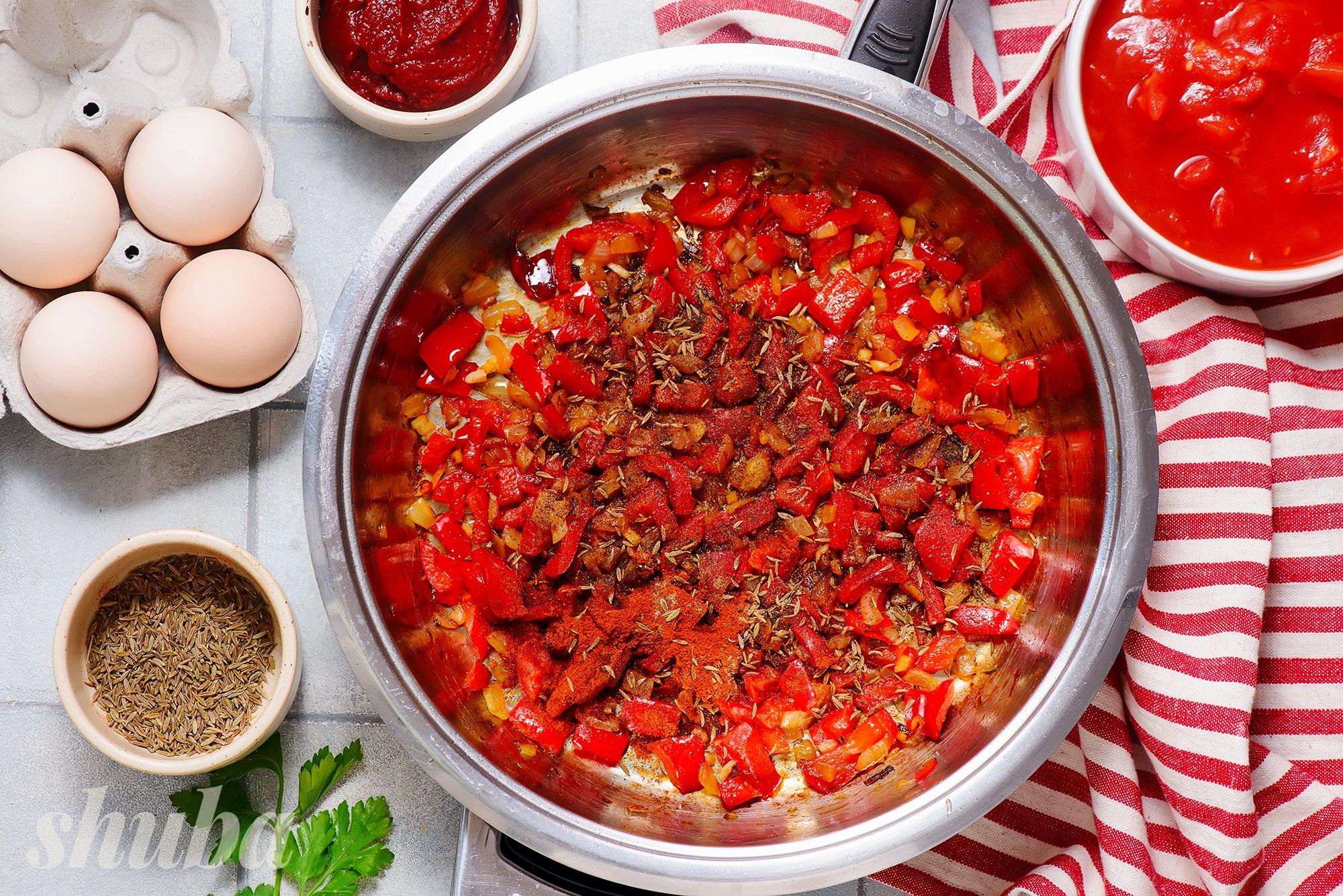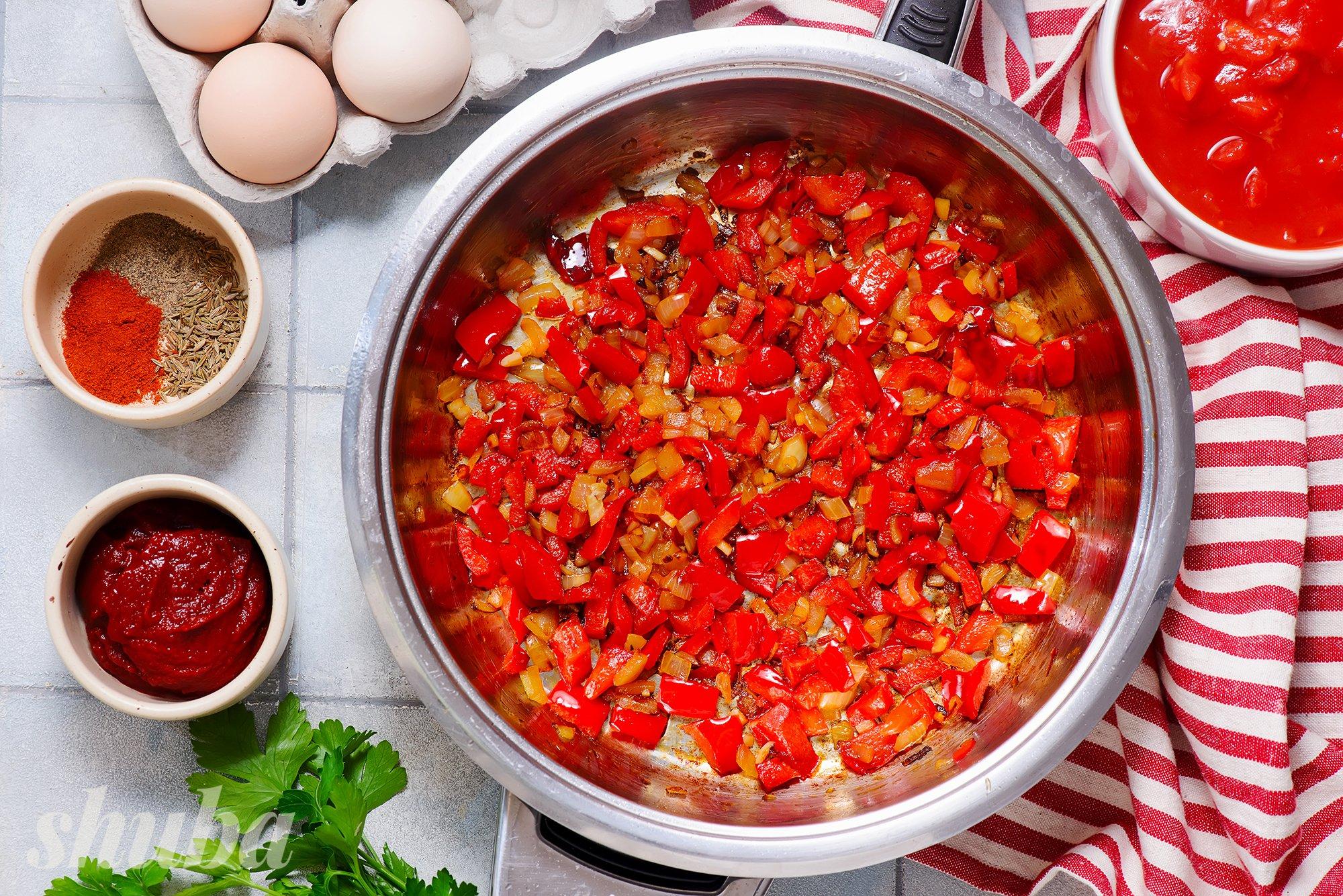 Класичні рецепти шакшуки містять цибулю та часник, а також паприку. Страва багата на вітаміни С та К, калій, фолієву кислоту.