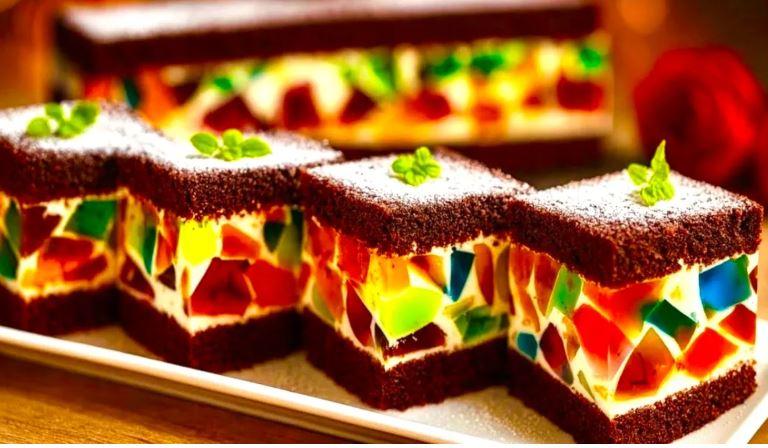 Зваріть желе та розлийте в окремі посудини. Коли вистигне - наріжте кубиками. Окремо для приготування білого крему змішайте 200 мл холодної води з желатином та залиште на 10 хвилин. Коли суміш дещо набухне, розтопіть желатин у мікрохвильовці або на паровій бані. Змішайте сметану або йогурт зі згущенкою або цукром. Додайте ваніль. Змішайте з теплим желатином та вилийте суміш на корж в посудині, яка має замкнені краї. Далі залиште на столі вистигати. Коли рідина буде кімнатної температури вкиньте нарізані кубики кольорового желе, перемішайте. Покладіть зверху другий корж торта і помістіть в холодильник. Вживайте з чаєм або кавою.