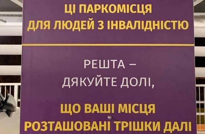 “Ці паркомісця для людей з інвалідністю”. Решта – дякуйте долі, що ваші місця розташовані трішки далі”, – йдеться на табличці.
