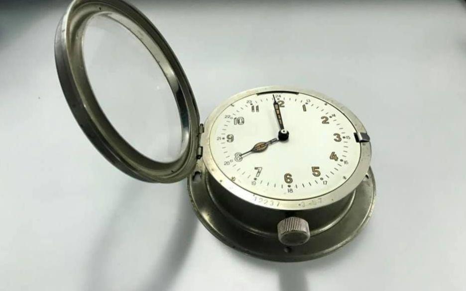 - годинник корабельний, каютний у комплекті з ключем, з відкривною кришкою під якою вибитий номер та напис «сделано в СССР»;