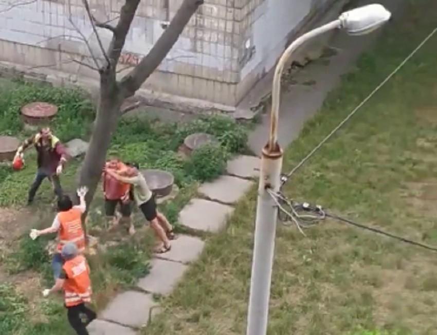 На ньому видно, що один робітник підпилює дерево бензопилою, а кілька інших підтримують стовбур. Але щось йде не так і дерево починає падати прямо в бік комунальників. Ті розбігаються в різні боки, а дерево падає та обриває проводи.
