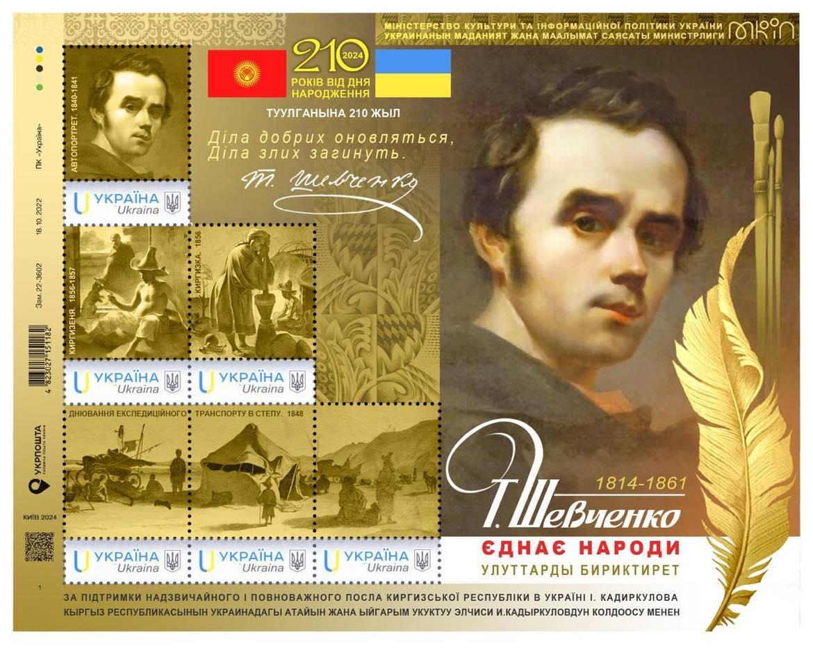 Номерний марковий аркуш «Т. Шевченко єднає народи» створено до 210-річниці від дня народження великого Кобзаря.
