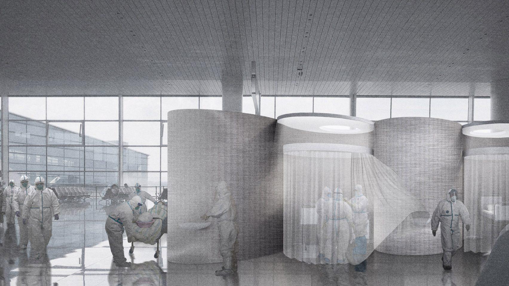 Архитекторы студии говорят, что изолированная локация аэропорта дает огромное преимущество, так как зараженные не будут вступать в контакт с пациентами с другими болезнями, как в обычных больницах.