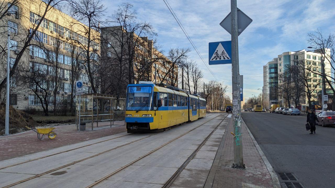 Як зазначається, трамваї № 14, 15 курсують оновленим Дегтярівським шляхопроводом, на якому повністю оновили рейки, посилили монолітні плити полотна.