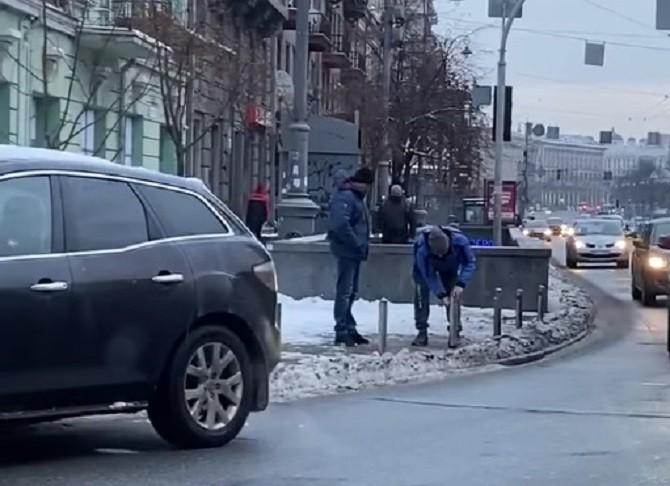 На відео можна помітити автівку Mazda, яка самотньо блимає “аварійкою” на узбіччі, в той час як її пасажири намагаються демонтувати один з антипаркувальних стовпчиків.