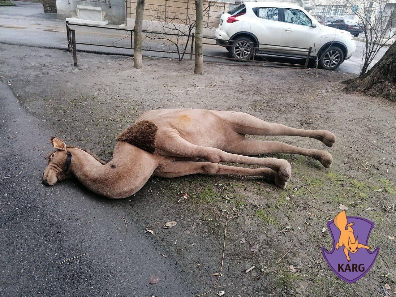 З вулиці Лейпцизької повідомили, що біля будинку лежить хворий верблюд. Екіпаж, що прибув на місце, знайшов іграшкового верблюда натурального розміру.
