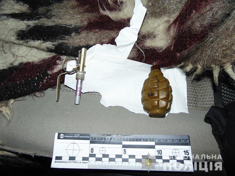 Під час патрулювання території Дніпровського району, неподалік Труханового острову, патрульні поліцейські зупинили автомобіль «Мерседес», водій якого порушив правила дорожнього руху. Під час огляду транспортного засобу правоохоронці виявили у салоні іномарки предмет, схожий на гранату.