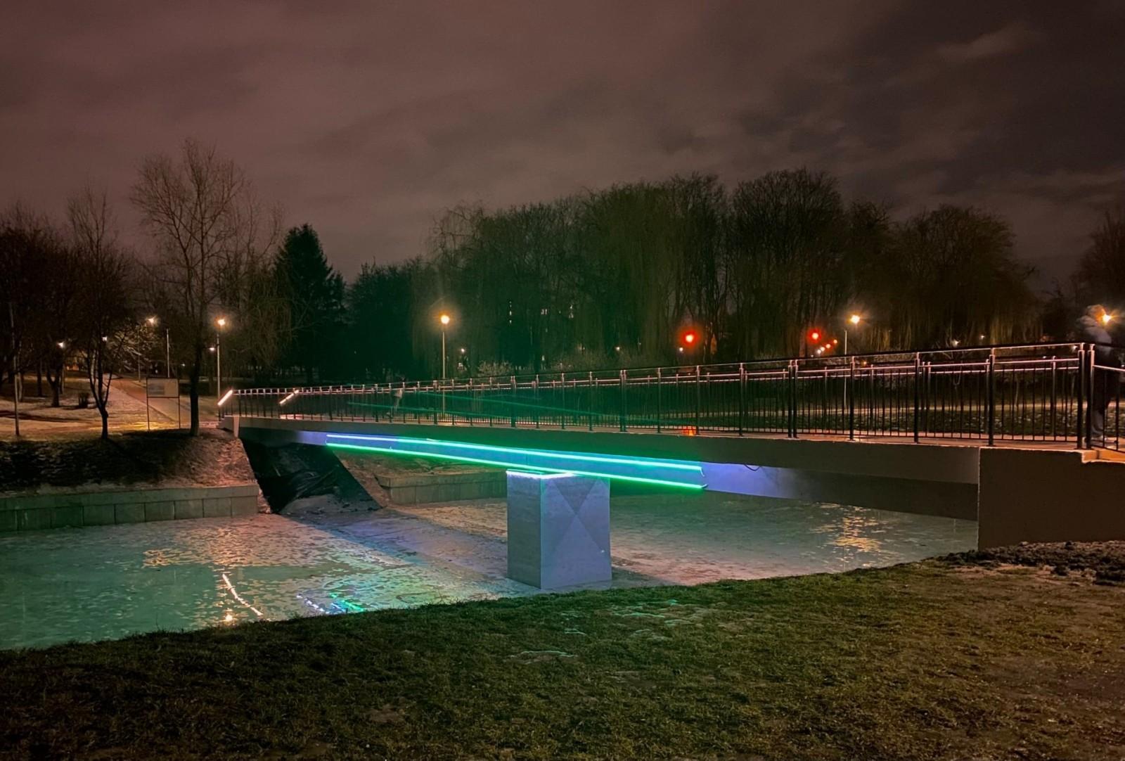Родзинкою цього пішохідного мосту є LED-підсвічування на перилах та вздовж нижнього краю конструкції.