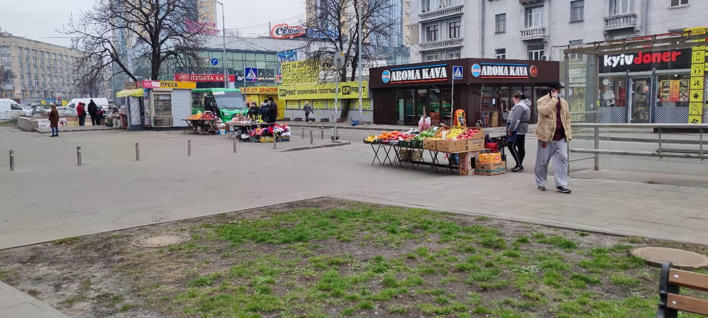 “Не зважаючи на карантин, в Солом’янському районі тривають поодинокі ярмарки. Деякі біля метро, а деякі просто на пішоходному переході. Мешканці та гості столиці поспішають придбати дефіцитну картоплю невідомого походження та домашні банани”, – підписав фото автор, Grigoriy Leo.