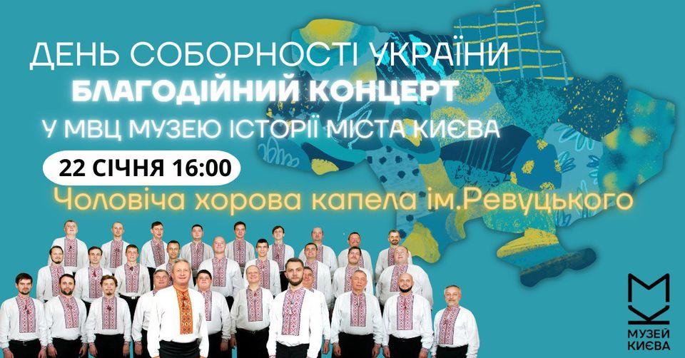 Як повідомляється, у День Соборності України, киян запрошують до Музейно-виставкового центру Музею історії міста Києва на благодійний концерт Чоловічої хорової капели ім. Л.Ревуцького.